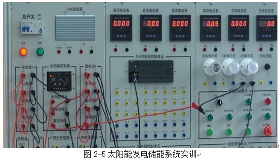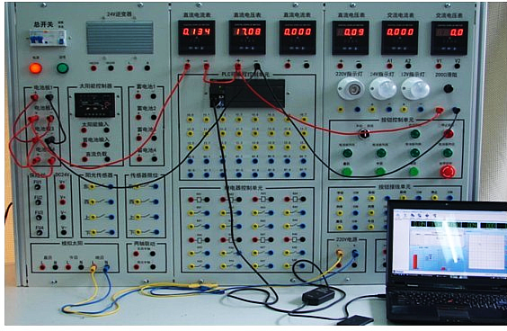 光伏發(fā)電控制監(jiān)控系統(tǒng)由電池板單元、太陽能控制器單元、蓄電池單元、保險單元、陽光傳感器、傳感器限位單元、模擬太陽單元、兩軸聯(lián)動單元、plc控制單元、繼電器單元、按鈕及按鈕接線單元、和相應(yīng)的逆變器儀表電源組成。光伏發(fā)電控制監(jiān)控系統(tǒng)采用接插線的形式進行接線,方便學生自行設(shè)計實訓(xùn)。