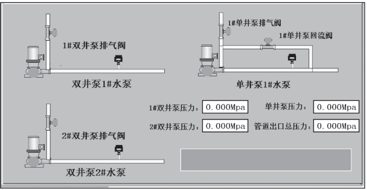 智能電量儀表隨時監(jiān)測各個水泵的電壓、電流、有功功率、總用電量。并動態(tài)顯示在觸摸屏畫面上。觸摸屏共有5幅畫面,分別顯示流程圖、狀態(tài)及操作、故障等相關(guān)信息。