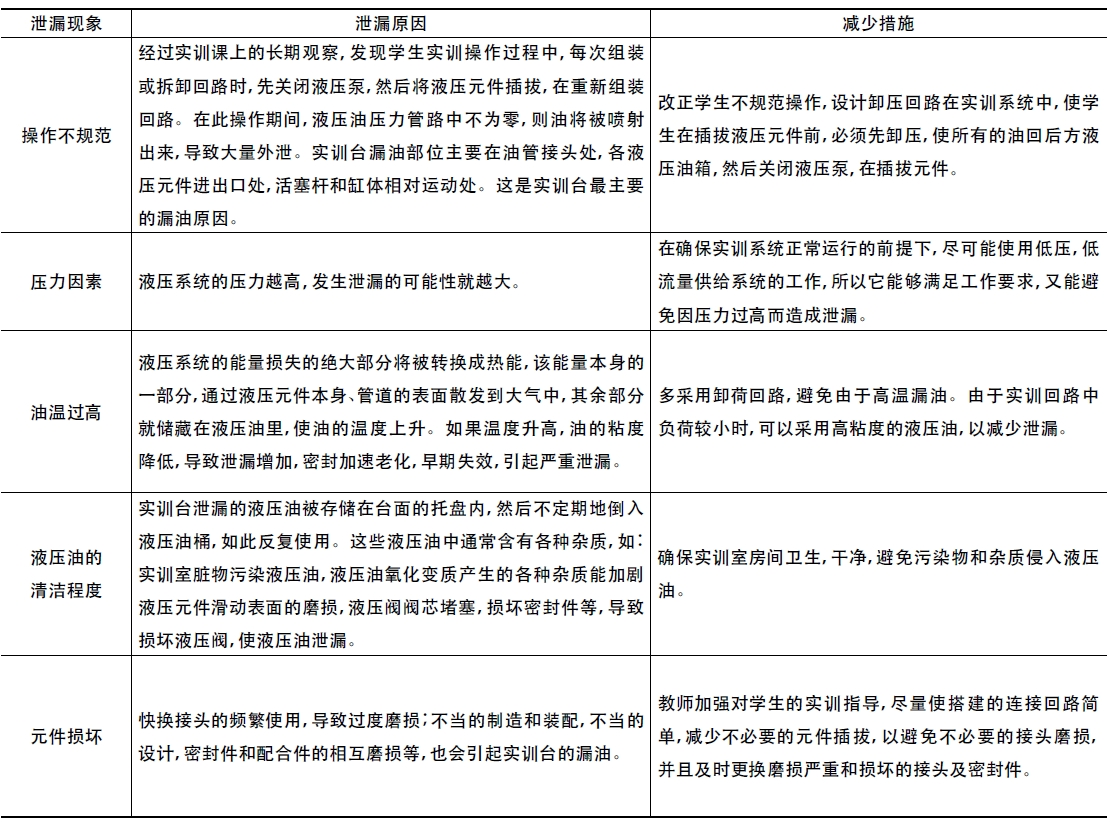 學(xué)生使用實(shí)訓(xùn)臺(tái)的過(guò)程中,通過(guò)長(zhǎng)時(shí)間的觀察,發(fā)現(xiàn)一個(gè)比較嚴(yán)重的問(wèn)題: 當(dāng)學(xué)生完成實(shí)訓(xùn)后,油管的外壁覆蓋有液壓油,實(shí)訓(xùn)臺(tái)上的托盤內(nèi)充滿液壓油,有時(shí)在地面上也出現(xiàn)液壓油。這一現(xiàn)象,不僅污染實(shí)訓(xùn)室環(huán)境,影響了學(xué)生的安全,并且影響下一次實(shí)訓(xùn)的正常進(jìn)行,甚至?xí)绊懙綄W(xué)生動(dòng)手操作的熱情。針對(duì)這一問(wèn)題,我們進(jìn)行了深入分析。泄漏,通常是指在液壓系統(tǒng)正常工作的情況下,從液壓元件的密封間隙漏出少許油液的現(xiàn)象。液壓系統(tǒng)的泄漏,通常情況分為兩種: 外泄漏和內(nèi)泄漏。內(nèi)泄漏是指油液從液壓元件的高壓腔流向低壓腔,例如液壓傳動(dòng)系統(tǒng)中液壓油從高壓腔向低壓腔的泄漏、換向閥內(nèi)壓力管道向回油管道的泄漏等; 外泄漏是指油液從系統(tǒng)內(nèi)部流到系統(tǒng)外部的泄漏,如齒輪泵的端面泄漏、液壓油管的滲透等。液壓實(shí)訓(xùn)臺(tái)泄漏分析及防漏辦法。
