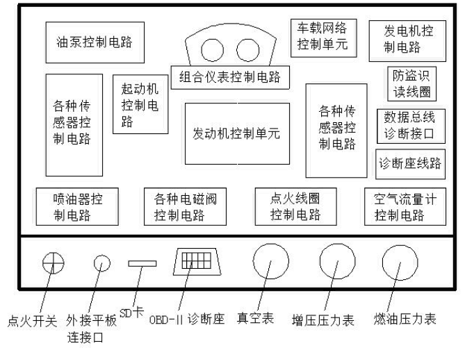 ①實(shí)驗(yàn)臺(tái)控制面板的改進(jìn)。將現(xiàn)有面板改成易于操作和觀看的面板。改進(jìn)后的面板應(yīng)包括:數(shù)據(jù)顯示區(qū)域,通用故障診斷接口區(qū)域,檢測(cè)端口區(qū)域、發(fā)動(dòng)機(jī)電路連接區(qū)域、故障設(shè)置連接口和控制單元等。
