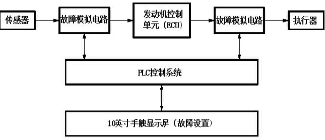 ③故障模擬電路的設(shè)計(jì)。現(xiàn)有實(shí)驗(yàn)臺(tái)只能通過(guò)控制開(kāi)關(guān)設(shè)置故障,不能模擬發(fā)動(dòng)機(jī)元件異常產(chǎn)生的故障,因此需要在發(fā)動(dòng)機(jī)電控系統(tǒng)加入PLC控制電路,通過(guò)改變傳感器、執(zhí)行器等信號(hào),影響發(fā)動(dòng)機(jī)的正常工作,模擬汽車工作過(guò)程中的實(shí)際故障現(xiàn)象。