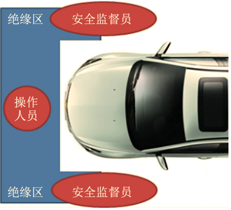 (2)盡管在新能源高壓實(shí)操之前,已經(jīng)利用信息化手段進(jìn)行了虛擬練習(xí),但還需要額外的手段來保障操作安全。在實(shí)際授課過后,經(jīng)過總結(jié),我們認(rèn)為按圖4的布置來組織實(shí)車操作可以很大程度避免人為因素帶來的安全風(fēng)險(xiǎn)。