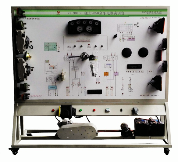 2、設備面板采用耐創(chuàng)擊、耐污染、防火、防潮的高級鋁塑板,表面經特殊工藝噴涂底漆處理;面板打印有永不褪色的彩色電路圖;學員可直觀對照電路圖和實物,認識和分析汽車整車電器各系統(tǒng)的工作原理。