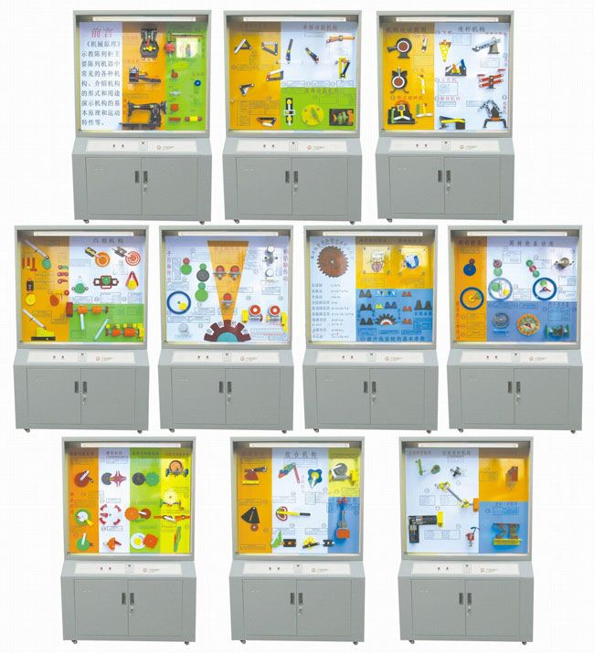 | 第八柜 間歇運動機構 | 55、齒式棘輪機構、內棘輪機構 56、磨擦式棘輪機構 57、槽輪機構 58、內嚙合槽輪機構 59、球面槽輪機構 60、齒輪式間歇機構 61、漸開線不完全齒輪機構、擺線針輪不完全齒輪機構 62、誤差較正機構 63、停歇曲柄連桿機構 64、停歇導桿機構 |