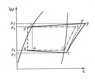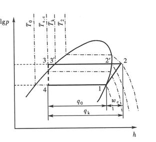 注:為理論循環(huán)的等熵壓縮過程:為實際循環(huán)的壓縮過程。