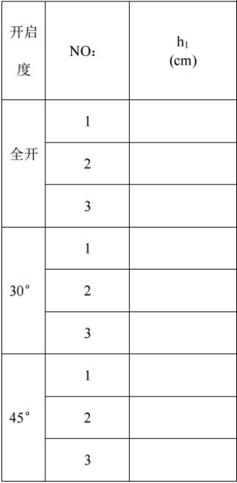1.本實(shí)驗(yàn)共進(jìn)行三組實(shí)驗(yàn):閥門全開(kāi)、開(kāi)啟30°、開(kāi)啟45°,每組實(shí)驗(yàn)做三個(gè)實(shí)驗(yàn)點(diǎn)。