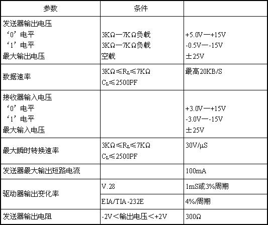 由于RS-232是早期為促進(jìn)公用電話網(wǎng)絡(luò)進(jìn)行數(shù)據(jù)通信而制定的標(biāo)準(zhǔn),其邏輯電平對地是對稱的,完全與TTL、CMOS邏輯電平不同。RS-232的邏輯電平規(guī)定:邏輯‘0’電平為+5~+15V,邏輯‘1’電平為-5~-15V。因此具有RS-232電平的器件與具有TTL電平的器件要互相連接必須先經(jīng)過電平轉(zhuǎn)換。表23-1為現(xiàn)行的EIA/TIA  RS-232E,CCITTV.28標(biāo)準(zhǔn)摘要: