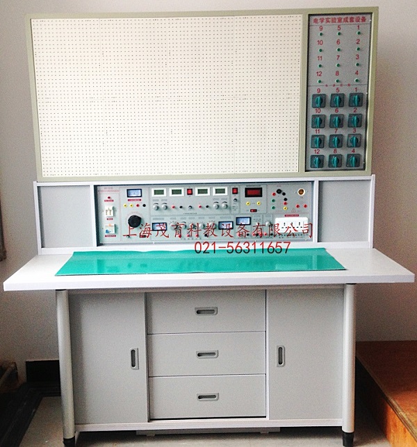 具有較完善的安全保護措施,較齊全的功能。電工電子實驗桌中央配有通用電路板,電路板注塑而成,表面布有九孔成一組相互聯(lián)通的插孔,元件盒在其上任意拼插成實驗電路,元件盒盒體透明,直觀性好,盒蓋印有永不褪色元件符號,線條清晰美觀。盒體與盒蓋采用較科學的壓卡式結構,維修拆裝方便。